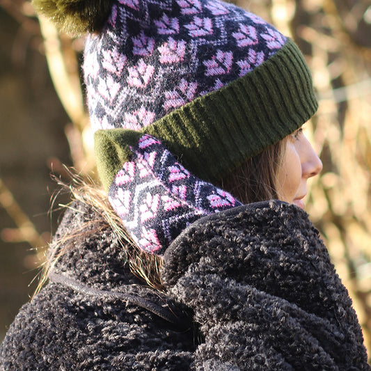Deep Khaki and Pink Mix Fairisle Beanie Hat