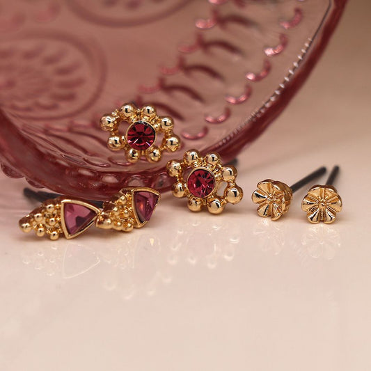 POM Faux Gold Plated Triple Stud Set with Pink Crystal