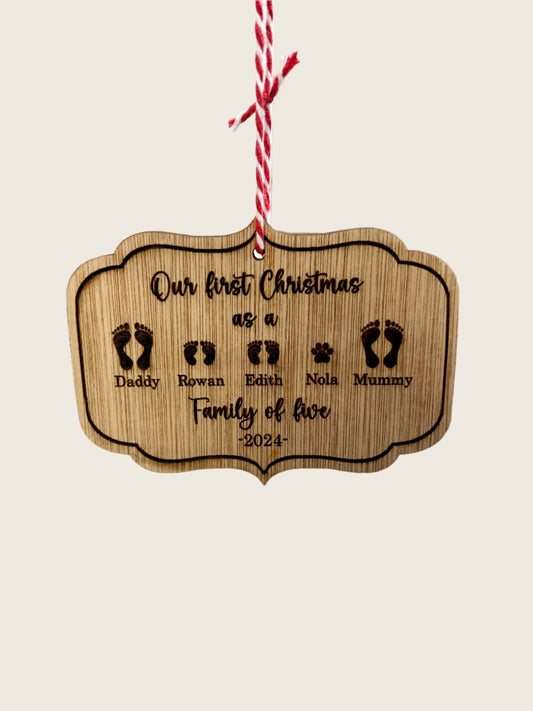 Personalised Wooden Christmas Decoration | Family Names & Paw Prints | First Christmas Keepsake