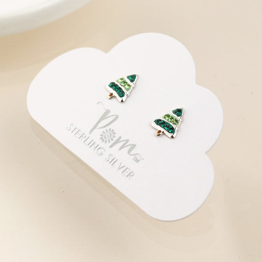 Sterling Silver Christmas Tree Stud Earrings with Green Crystals