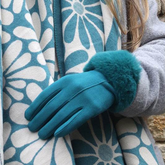Teal Faux Suede Gloves with Faux Fur Wrist Cuff – Stylish Winter Gloves