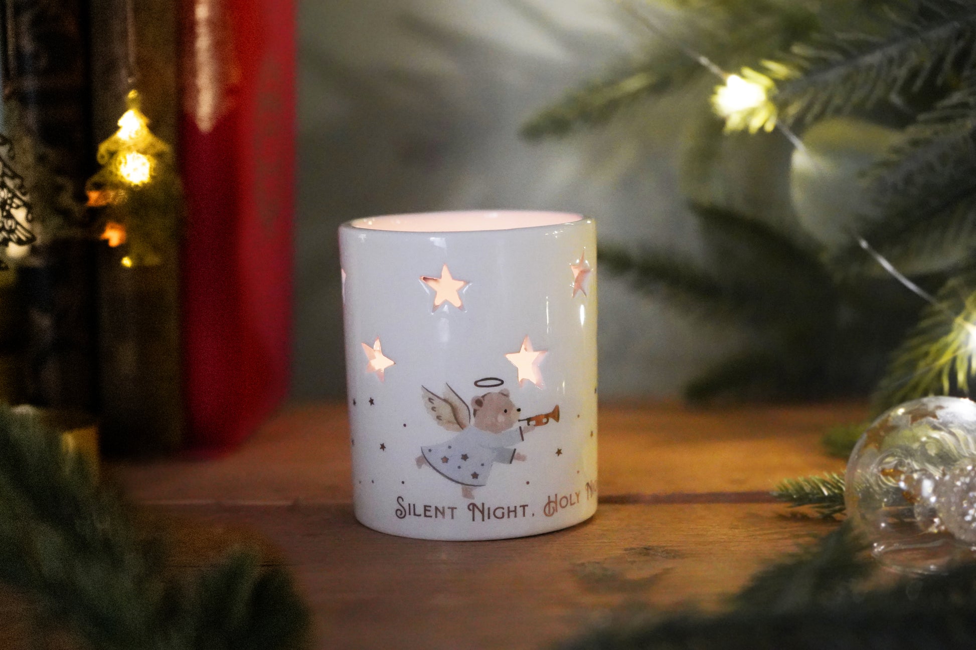 Create a warm festive glow with this White Ceramic Tealight Holder. Featuring star-shaped cut-outs, it casts a soft, calming light, perfect for cosy winter evenings. The charming angel bear design and “Silent Night, Holy Night, All Is Calm, All Is Bright” message add heartfelt charm to your décor. Beautifully boxed, it makes an ideal Christmas gift or keepsake.
