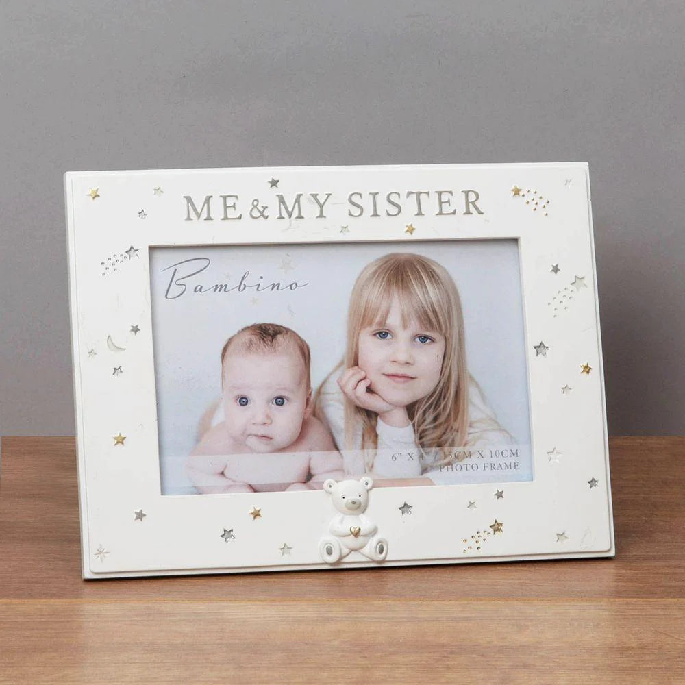This gorgeous white frame has a hand painted silver and gold starry design and adorable teddy bear holding a gold heart icon.