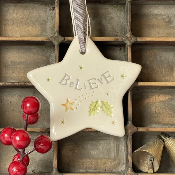 Handmade Hanging Ceramic Decoration with Thoughtful Message- Christmas Believe Star
