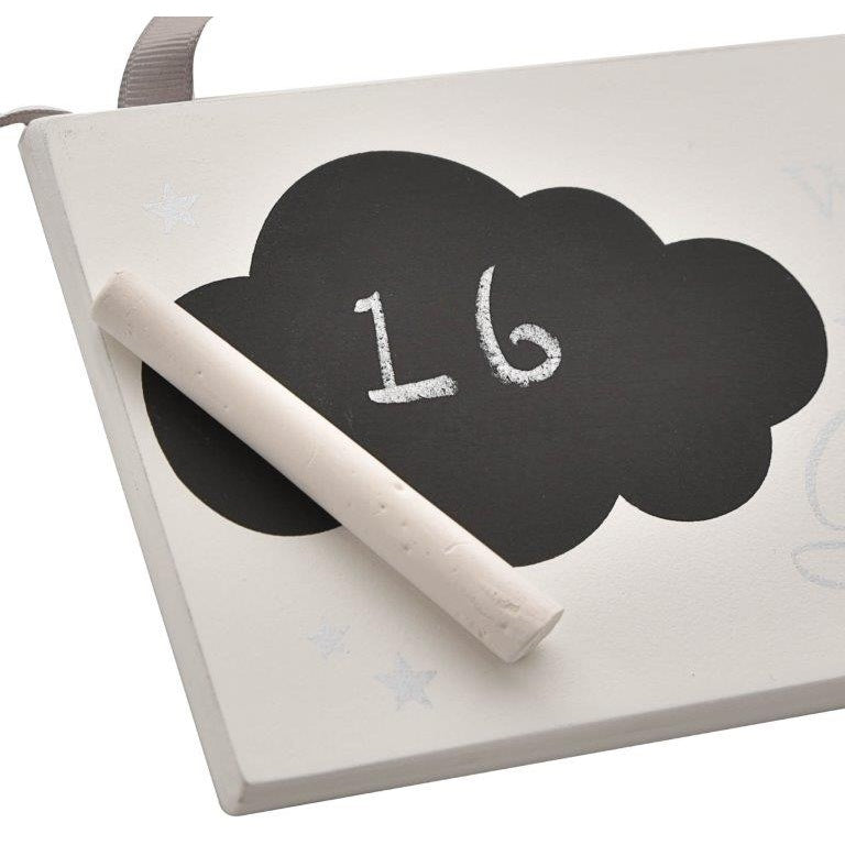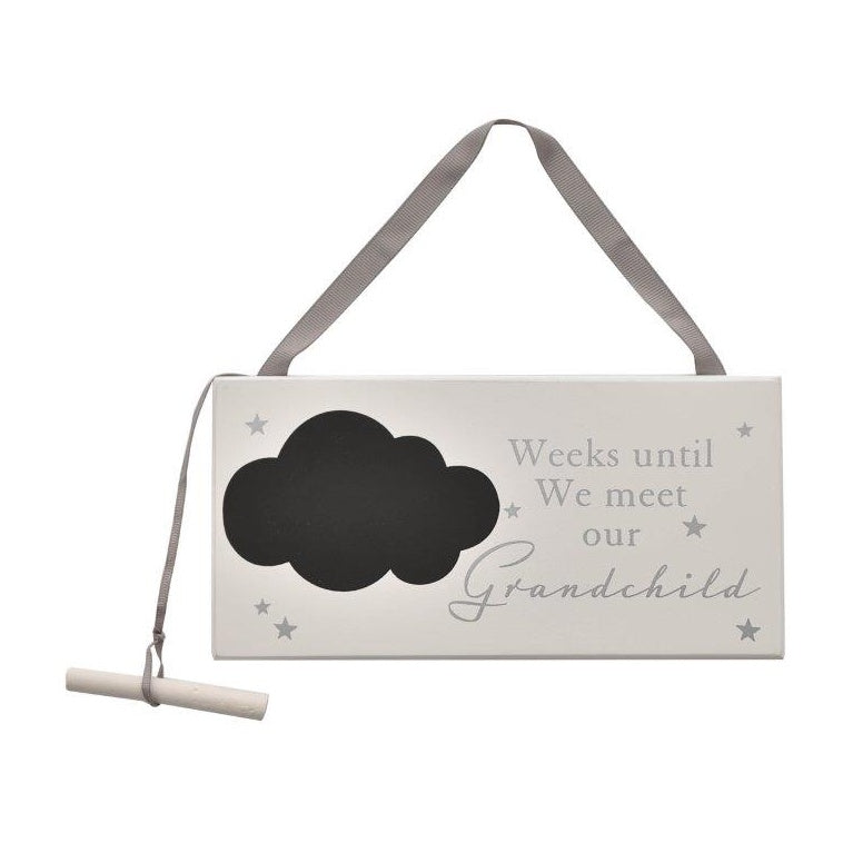 The wooden plaque features a white finish, enhanced by silver stars, complementary hanger and Weeks Until We Meet Our Grandchild decal. It is completed by a cloud-shaped chalkboard area for weekly countdown towards babys due date.