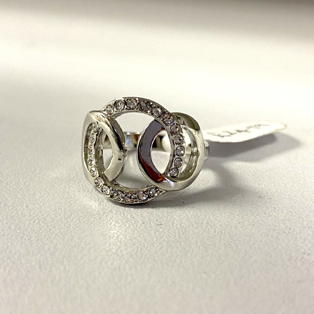 Silver plated triple circle ring - middle circle set with clear cut crystal stones.