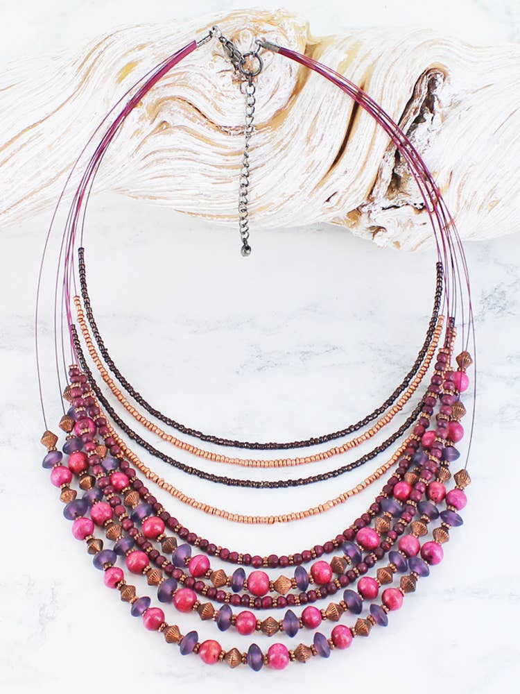 Multi-Strand Layered Bead Necklace - Pink & Purple Tones
