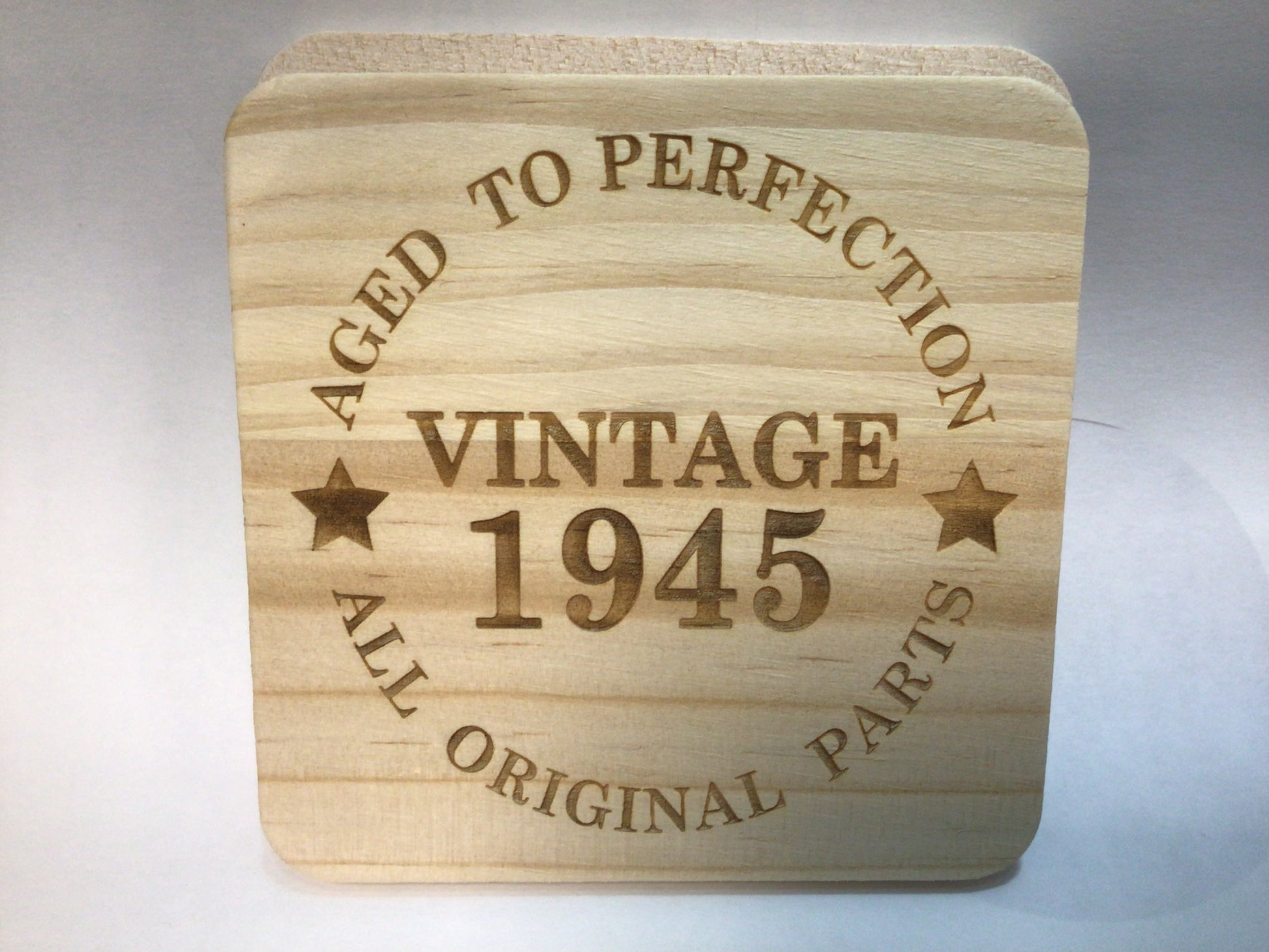 Celebrate the milestone of 80 years with this beautifully crafted wooden coaster, engraved with the sentiment, "Aged to perfection, All original parts. Vintage 1945." A perfect keepsake and practical gift, it’s an ideal way to commemorate a loved one’s 80th birthday. Made from high-quality wood, this durable coaster combines charm and functionality, making it a standout addition to any coffee table or drinks station. Thoughtfully designed, it’s a heartfelt way to honour their journey and celebrate their legacy. Gift them a smile with this timeless treasure!