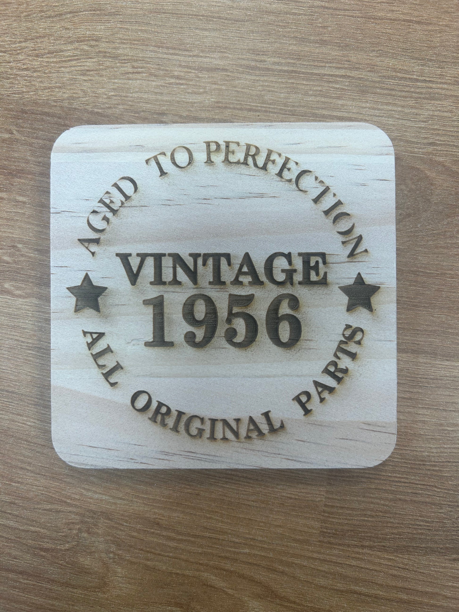 Celebrate the milestone of 70 years with this beautifully crafted wooden coaster, engraved with the sentiment, "Aged to perfection, All original parts. Vintage 1956." A perfect keepsake and practical gift, it’s an ideal way to commemorate a loved one’s 70th birthday. Made from high-quality wood, this durable coaster combines charm and functionality, making it a standout addition to any coffee table or drinks station. Thoughtfully designed, it’s a heartfelt way to honour their journey and celebrate their legacy. Gift them a smile with this timeless treasure!