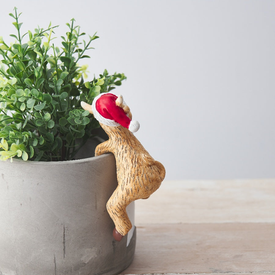 Add a touch of whimsy to your Christmas holiday décor with our charming Highland cow plant pot pal! Complete with a festive hat and a cute smile, this adorable ornament hangs onto any plant pot, measuring 12x7 cm. Perfect for bringing cheer to your home this Christmas!