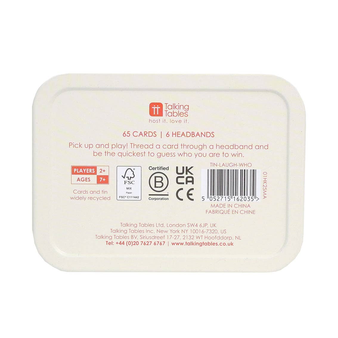 About Laugh in a Tin – Who Am I?: Guess, giggle and get the party going with Laugh in a Tin – Who Am I? The classic identity-guessing game gets a modern twist in a compact, reusable tin. Perfect for family nights, parties or travel fun, it’s a light-hearted favourite that’s as easy to play as it is to gift. Featuring bold, colour-block packaging inspired by contemporary trends, it’s a fun and stylish addition to any games collection. Size: 11cm x 8.2cm x 2.6cm Game Contents: 65 Cards, 6 Headbands Material: Tin Players: 2+ Ages: 7+