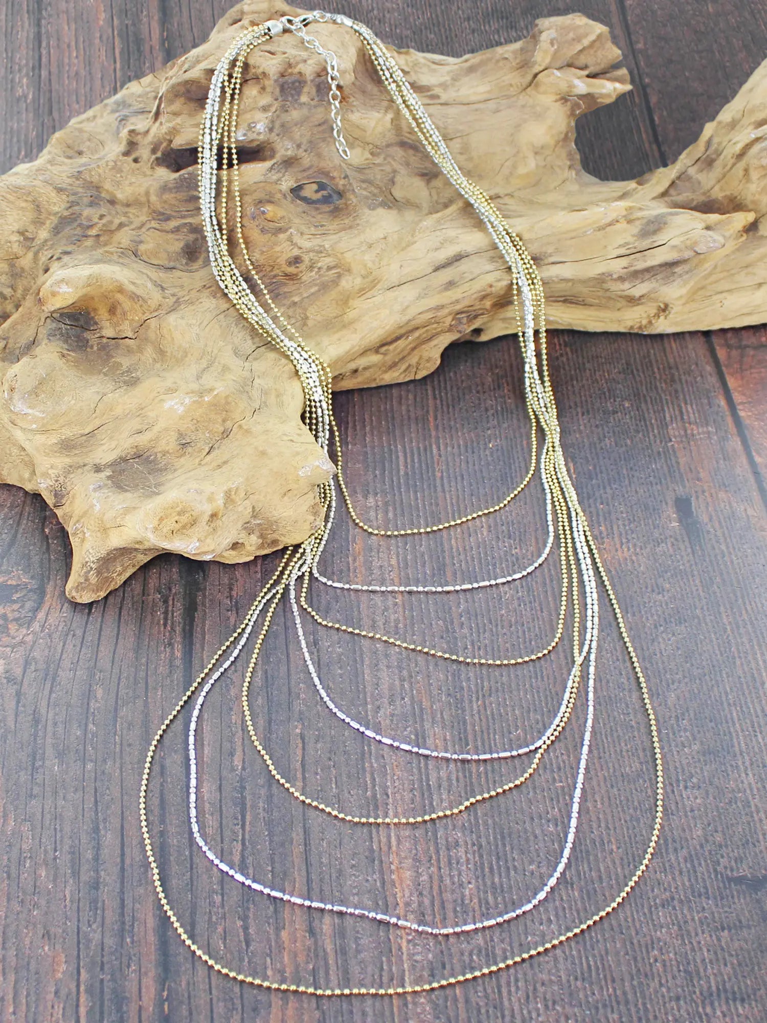 - Long layered necklace with fine gold and silver-tone beads