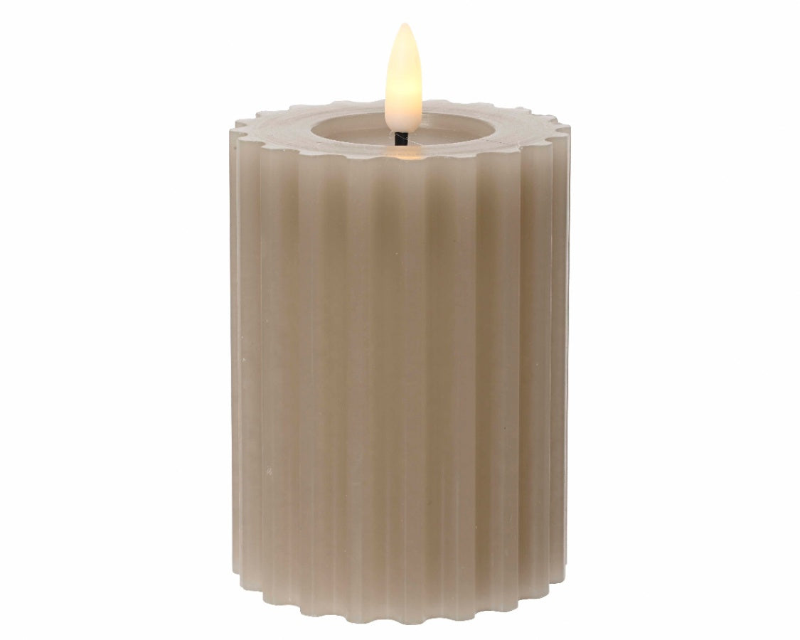 A chic natural earthy coloured wax candle with a carved design and warm glow LED flame.