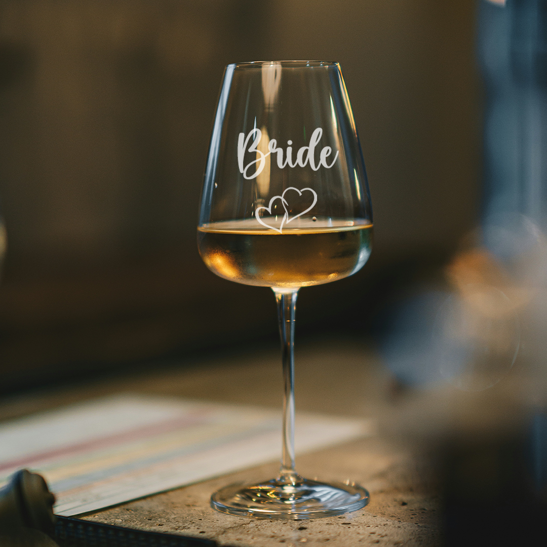 Raise a toast to unforgettable moments with the Sweet P bespoke wine glass. Personalised with "Bride" and you can also add the wedding date to the glass. Crafted in-house for a truly unique touch. Perfect as a wedding or hen party gift, this elegant keepsake makes any special day unforgettable.