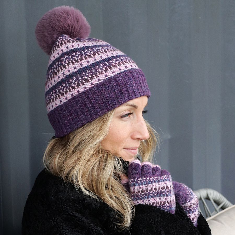 Peace of Mind Purple and pink Fair Isle knit bobble hat with purple faux fur pom-pom. Contains 65% recycled yarn.