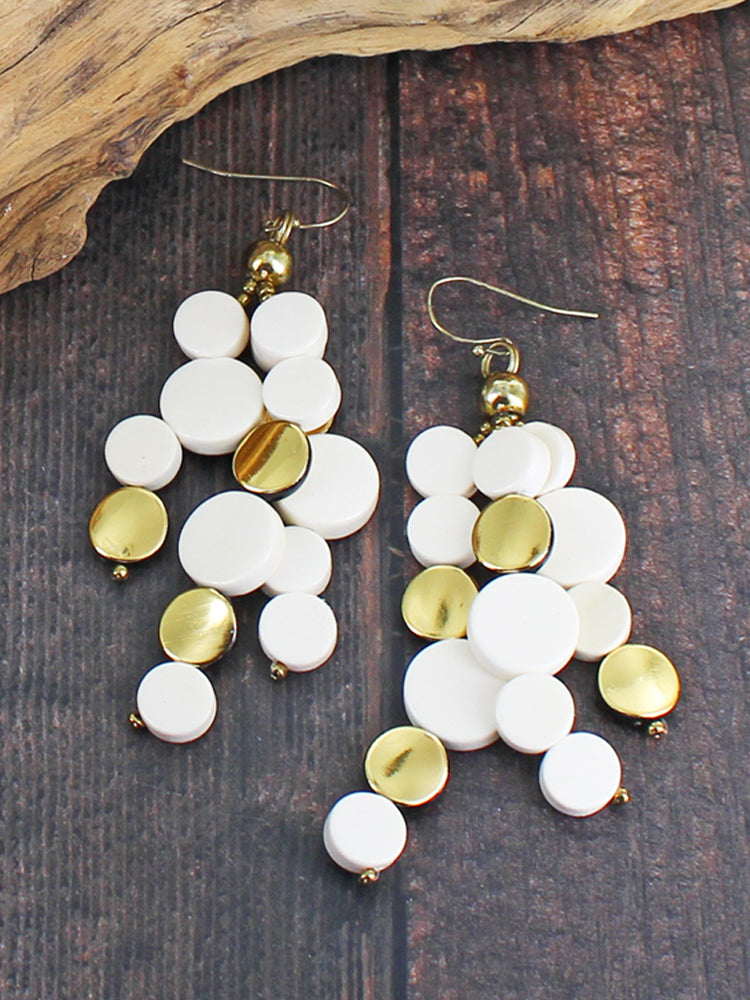 Add a touch of elegance to your ensemble with our Disc Drop Earrings in a soft, ivory cream and gold hue. Designed by Suzie Blue, renowned for bold colors and statement pieces, these earrings are crafted with care, ensuring a unique addition to your jewellery collection. Experience the artistry of our artisan suppliers firsthand with this exclusive accessory.